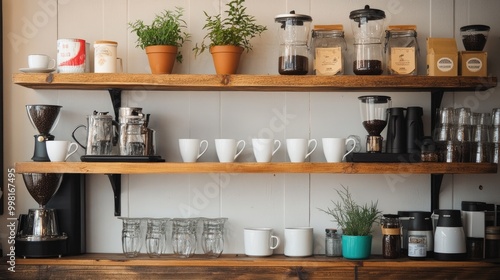 A rustic wooden shelf in a coffee shop displaying coffee mugs, brewing equipment, and small plants.