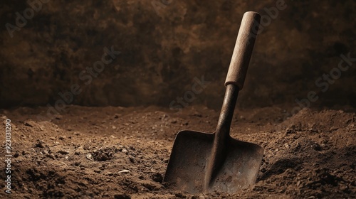A rusty shovel is sitting in the dirt. The shovel is old and worn, but it still has a purpose. The image has a mood of nostalgia and a sense of history. The shovel represents the hard work