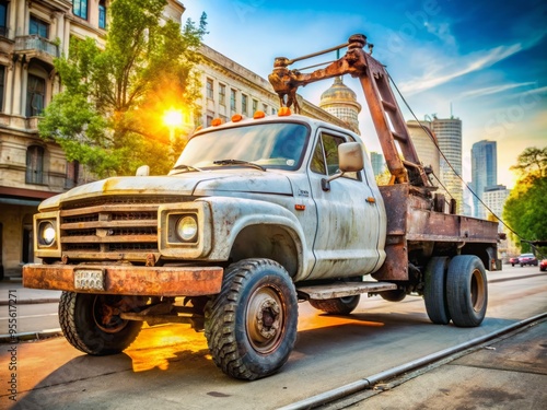 A rusty tow truck's heavy-duty wheels and sturdy frame lift a stranded vehicle's front end off the pavement