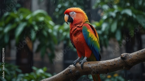 A scarlet macaw perched on a branch in a lush tropical rainforest, with rain falling in the background.