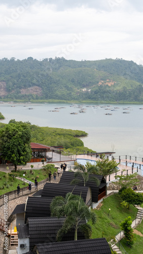 A scenic hillside resort overlooking a mangrove-lined bay with floating fishing boats. Wooden lodges and modern cottages blend with lush greenery, creating a peaceful retreat in a tropical paradise.