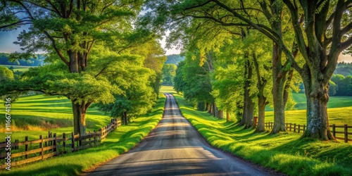 A scenic old country road surrounded by lush green trees and fields , rural, countryside, rustic, vintage, pathway
