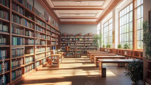 A school library filled with rows of bookshelves, study tables, and a cozy reading corner by the window.