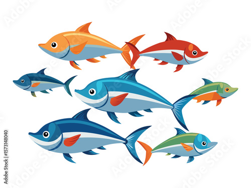 A school of colorful cartoon fish swimming together in a dynamic composition isolated on white background