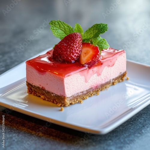 A scrumptious strawberry cheesecake with a graham cracker crust and a fresh strawberry topping, elegantly presented on a white plate, Strawberry cheesecake centered