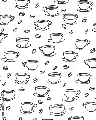 A seamless pattern featuring hand-drawn coffee cups and coffee beans on a white background..