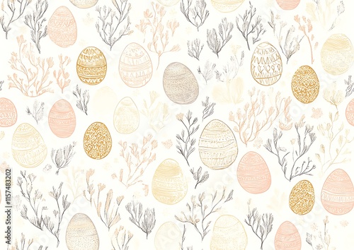 A seamless pattern of hand-drawn Easter eggs and spring flowers