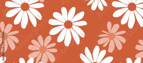 A seamless pattern of white and pink daisies on a rusty orange background. The flowers are stylized and graphic in nature creating a modern and cheerful aesthetic