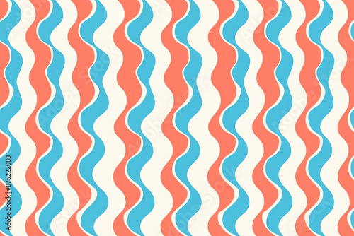 A seamless pattern with wavy stripes in alternating red, blue, and cream colors creating a retro feel.