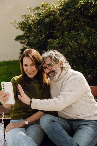 A senior White woman wearing a green sweater and jeans sitting on a wooden bench outside, smiling and video calling on a smartphone together with her senior White husband in a cream sweater.