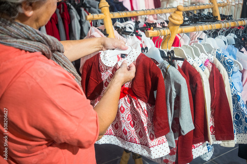 A senior woman, a gray-haired grandmother, who chooses a dress for her grandson. A lot of styles and colors are around her. Consumerism concept