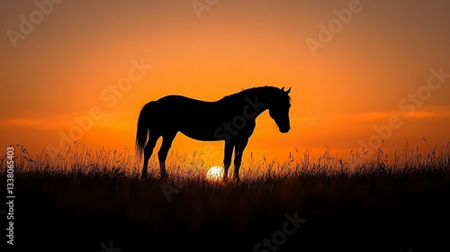 A serene countryside moment as a horse silhouette stands against the deep orange sky, its presence evoking a sense of freedom and peace,