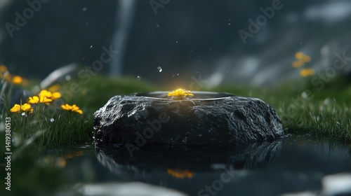 A serene, dark stone with a small, radiant yellow flower in the center, nestled in a puddle of water amongst lush green grass and wildflowers. Water droplets, cascading from a hidden waterfall,