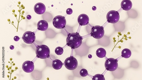A serene depiction of bakuchiol molecules surrounded by violet-glass elements, blending minimal botanical design against a soft pale background, perfect for wellness and beauty themes.