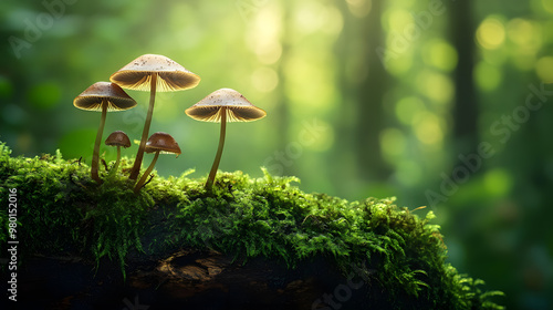 A serene forest scene with slender brown-capped mushrooms growing on a moss-covered log, illuminated by soft natural light.