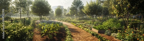 A serene garden pathway lined with lush greenery and trees, bathed in morning light, inviting tranquility and connection to nature.