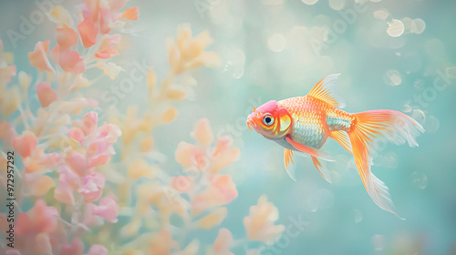 A serene goldfish gracefully gliding through a softly illuminated tank, captured in a close-up view, with a pastel background creating a peaceful atmosphere, highlighting the delicate features