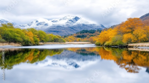 A serene lake reflects snow-capped mountains and autumnal trees. The composition is balanced, showcasing vibrant yellows and greens. The high-resolution image boasts excellent clarity and natural lig