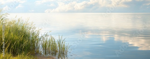 A serene lakeside view with gentle reflections, featuring lush grass and a calm sky, perfect for nature lovers and tranquility seekers.