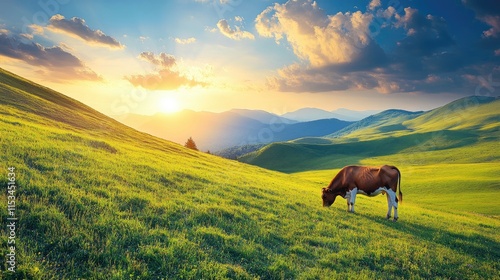A serene landscape featuring a grazing cow at sunset, highlighting nature's beauty.