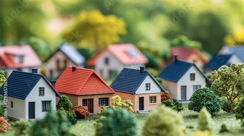 A serene landscape featuring numerous small houses scattered throughout a lush green field under a clear blue sky.