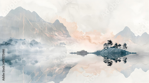 A serene landscape painting depicting a tranquil mountain scene with minimalist brushstrokes.