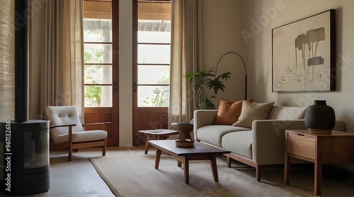 a serene living room where Japandi design, the elegant fusion of Japanese minimalism and Scandinavian warmth