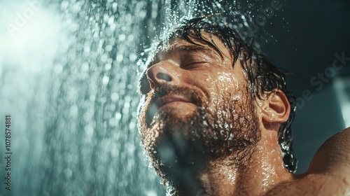 A serene man with a beard stands with eyes closed as a stream of water falls over him, capturing a powerful moment of solitude, peace, and internal meditation.
