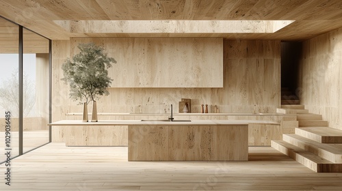 A serene minimalistic kitchen interior featuring natural wood tones and modern design elements enhances a tranquil and harmonious living space