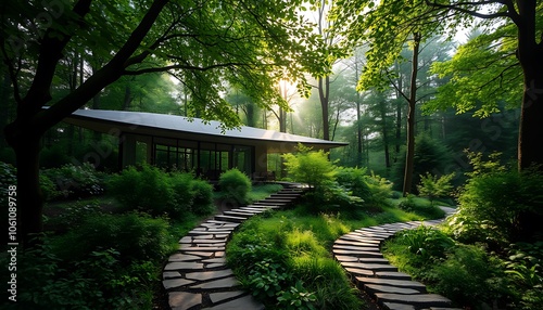A serene, modern retreat nestled deep within a vibrant, emerald forest, where the gentle slope of the roof and expansive windows blend seamlessly into the surrounding foliage.