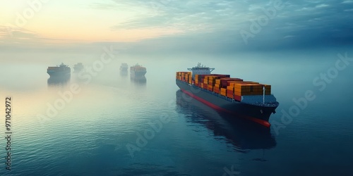 A serene morning scene of cargo ships navigating through a calm, foggy sea, showcasing tranquility and transportation.