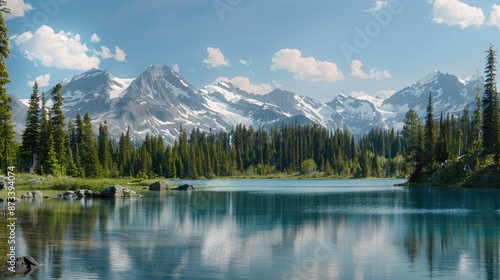 A serene mountain lake with clear blue water reflects the snow-capped peaks and white clouds of a picturesque landscape under a sunny sky