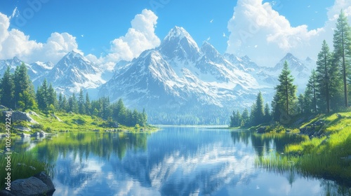 A serene mountain lake with snow-capped peaks reflecting in the clear water, surrounded by lush green forests and a blue sky with fluffy white clouds.