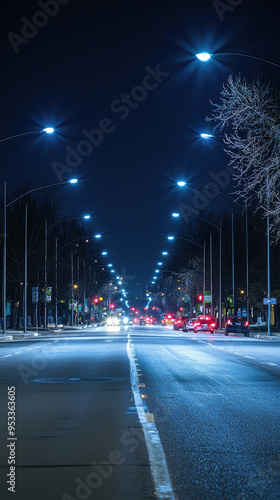 A Serene Night Drive: Streetlights illuminate a deserted city road, casting a magical glow on the wet asphalt.