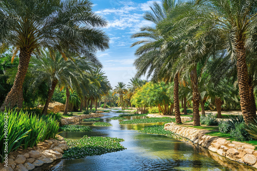 A serene oasis landscape featuring lush palm trees, tranquil water channels, and vibrant greenery. This picturesque scene captures essence of natures beauty and tranquility