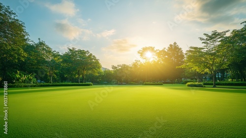 A serene outdoor lawn bowling green with a smooth surface and neatly placed bowls, surrounded by manicured grass and a bright sky, early morning light creating a tranquil ambiance