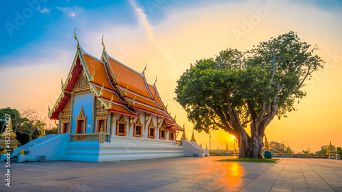 A serene photograph of a Thai Buddhist temple at sunset.