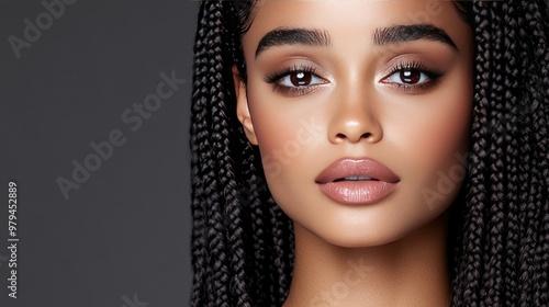 A serene portrait showcases an African American woman with long box braids and radiant skin, illuminated to reveal the elegance of her facial features