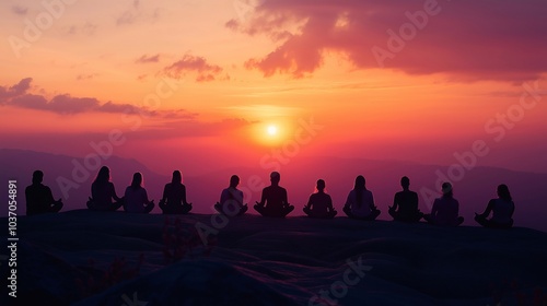 A serene sunset meditation session at a hilltop temple, with participants facing the horizon. The calm and spiritual atmosphere, symbolizing reflection, mindfulness, and connection to nature