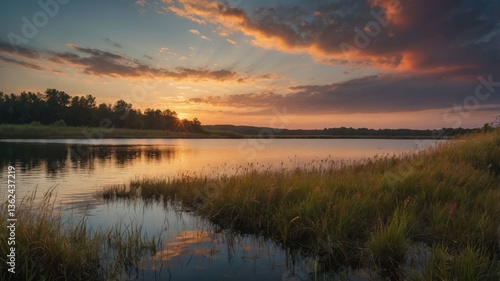 A serene sunset over a tranquil river, reflecting vibrant colors in the water.