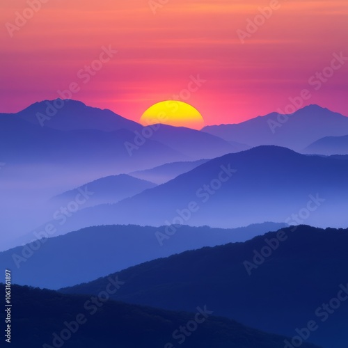 A serene sunset over misty mountains, showcasing vibrant colors and tranquility.
