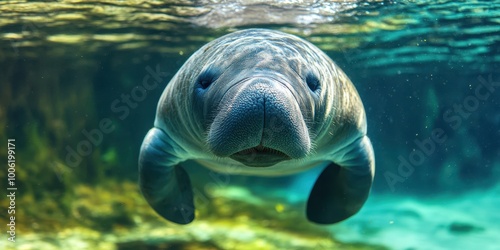 A serene underwater scene featuring a curious manatee gracefully swimming through crystal-clear water.