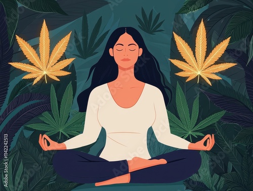 A serene woman meditates amidst stylized cannabis leaves, embodying tranquility and connection to nature.