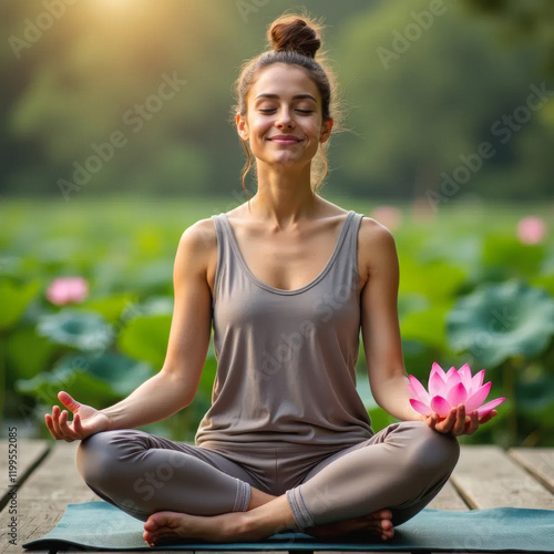 A serene young woman meditating outdoors by a lotus pond, holding a pink lotus flower in her hand. Her peaceful expression and natural surroundings create a sense of tranquility. Generative AI
