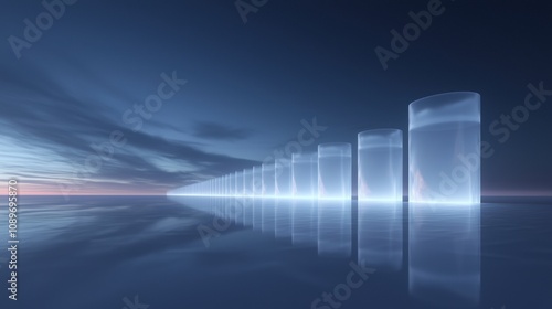 A series of clear glass cups are lined up on a body of water