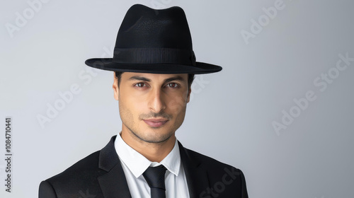 A serious man dons a hat, sporting a dark suit paired with a classic white shirt and career tie, showcasing tech elegance.