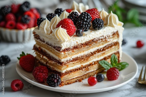 A serving of medovik, Russian honey cake, with a side of whipped cream and fresh berries.