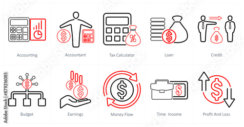A set of 10 accounting icons as accounting, accountant, tax calculator