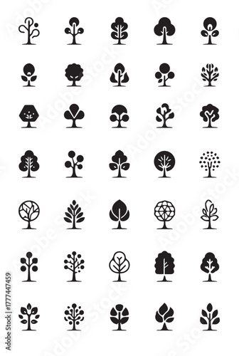 A set of 20 unique minimal tree icons in black and white. Clean geometric design inspired by nature and sustainability. Perfect for eco brands logo design web and app interfaces environmental graphics
