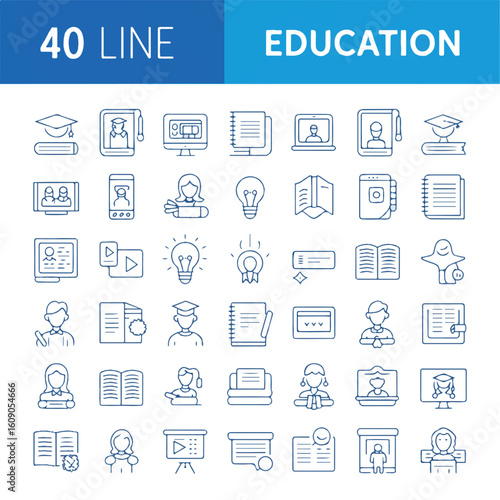 A set of 40 blue line art education icons arranged in 5 rows against a white background .